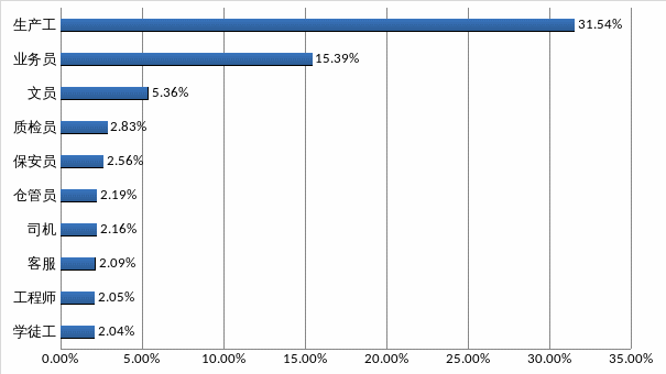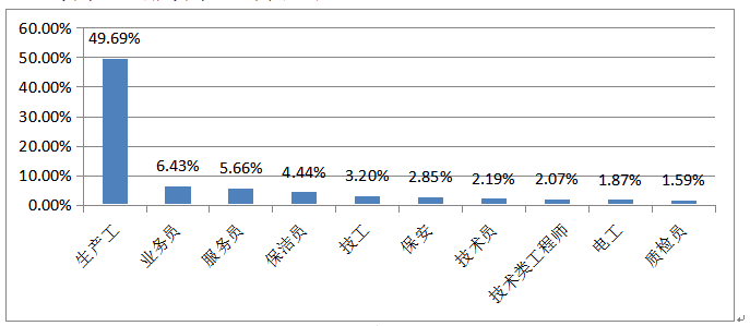 2021年,用人單位需求較大排名前三位的工種為生產工、業務員、文員,分別占工種總需求的31.54%、15.39%、5.36%,其中生產工的需求同比上升2.05%,業務員的需求同比下降1.88%,文員的需求同比上升0.10%。