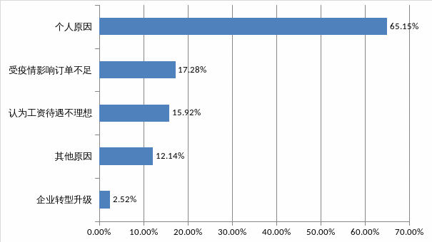 企業人員流失原因選“個人原因”的有65.15%,選“受疫情影響訂單不足”的有17.28%,選“認為工資待遇不理想”的有15.92%,選“其他原因”的有12.14%,選“企業轉型升級”的有2.52%。造成人員流失的主要是員工個人原因。