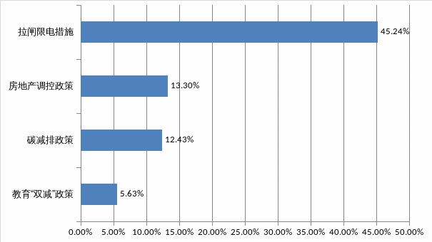 2021年,1030家企業經營主要受到以下政策的影響:“拉閘限電措施”“房地產調控政策”“碳減排政策”,分別有45.24%、13.30%、12.43%的企業受到以上政策影響。