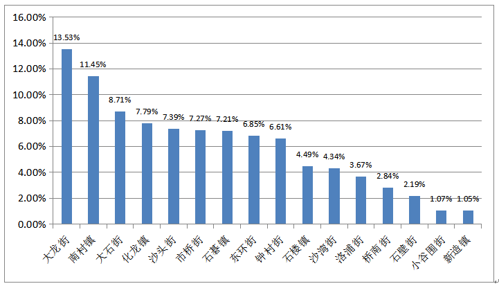2021年第四季度末,我區外來務工人員按就業地劃分,人數排名前三的鎮(街)是大龍街、南村鎮、大石街,占我區外來務工人員總數的比例分別為13.53%、11.45%、8.71%??傮w排名跟上季度相比沒有明顯變化。