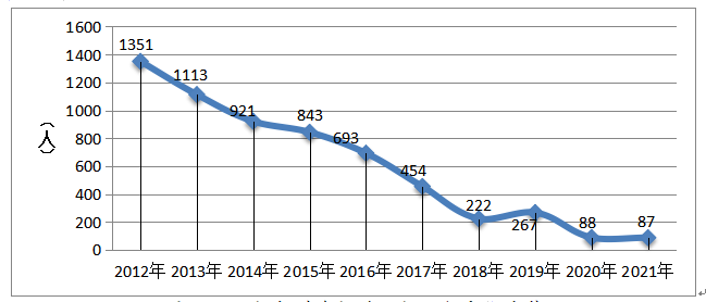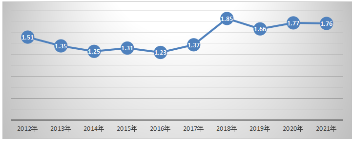 2021年,用工需求人數與求職人數的比率(求人倍率)為1.76,同比下降0.01,即從2020年平均1.77個崗位對應1名求職者,下降到2021年平均1.76個崗位對應1名求職者。