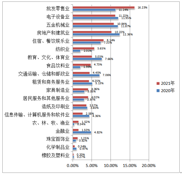 2021年,批發零售業、電子設備業、五金機械業占用工需求的前三位。用工需求同比變化較大的行業有:批發零售業,同比上升4.99%;紡織業,同比上升3.64%;金融業,同比下降3.32%。