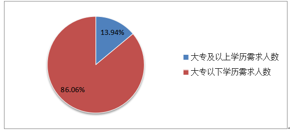2021年,用人單位對大專及以上學歷人員的需求占用工需求總量的13.94%,同比下降2.74%。