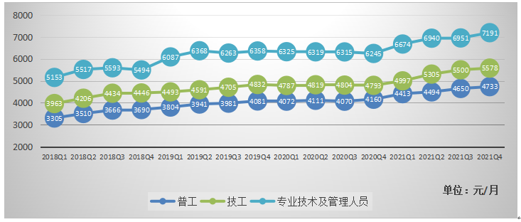 2021年第四季度末,企業在崗員工中,普工的平均工資為4733元/月,同比上升13.77%;技工的平均工資為5578元/月,同比上升16.38%;專業技術及管理人員的平均工資為7191元/月,同比上升15.15%。