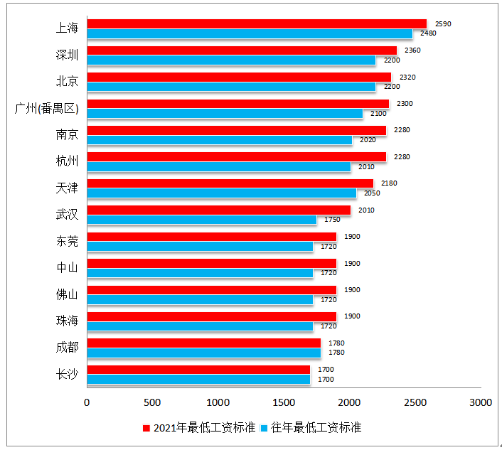 截至2021年末,十四個重點城市中有十二個城市的企業最低工資標準上調,上海市為2590元/月,同比提高了4.44%;深圳市為2360元/月,同比提高了7.27%;北京市為2320元/月,同比提高了5.45%;南京市為2280元/月,同比提高12.87%;杭州市為2280元/月,同比提高13.43%;天津市為2180元/月,同比提高了6.34%;武漢市為2010元/月,同比提高14.86%;東莞市、中山市、佛山市、珠海市均為1900元/月,同比提高了10.47%。番禺區企業最低工資執行廣州市的標準為2300元/月,同比提高了9.52%,非全日制職工小時最低工資標準調整為22.2元/小時。其他地區不變。