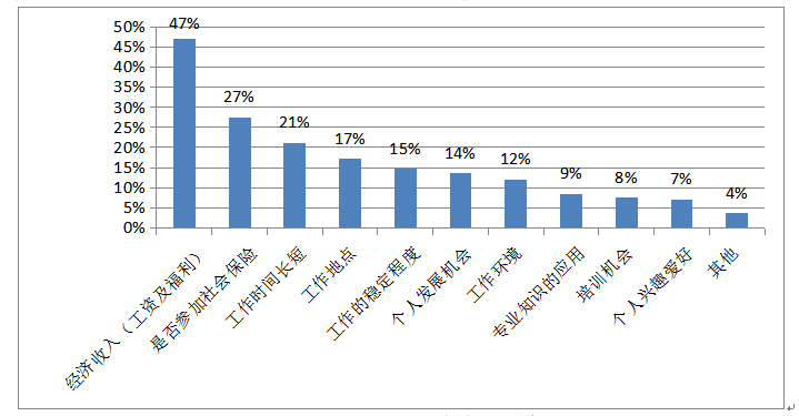 2021年,求職者求職主要考慮以下因素:經濟收入(工資及福利),有47%求職者選擇;是否參加社會保險,有27%求職者選擇;工作時間長短,有21%求職者選擇。