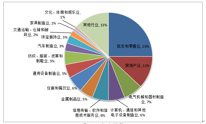 2021年第四季度,我區1030家“四上”企業主要分14個行業分析,分別是:批發和零售業,房地產業,電氣機械和器材制造業,計算機、通信和其他電子設備制造業,信息傳輸、軟件和信息技術服務業,金屬制品業,住宿和餐飲業,通用設備制造業,紡織、服裝、皮革和制鞋業,汽車制造業,珠寶首飾業,交通運輸、倉儲和郵政業,家具制造業,文化、體育和娛樂業。其中,企業數量最多的是“批發和零售業”,占比25%;企業數量最少的是“家具制造業”和“文化、體育和娛樂業”,占比都只有1%。