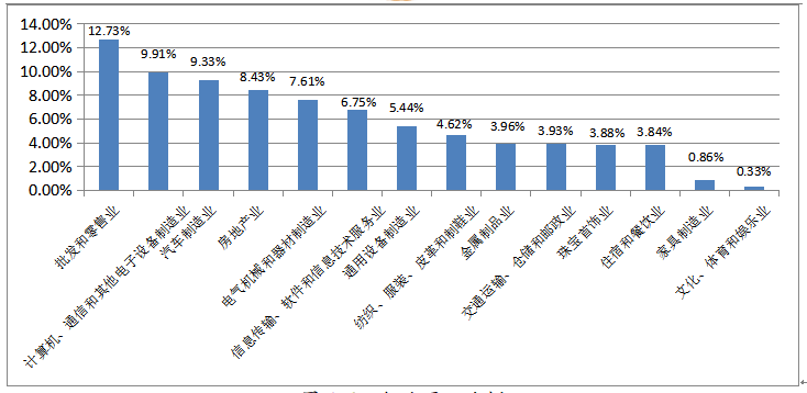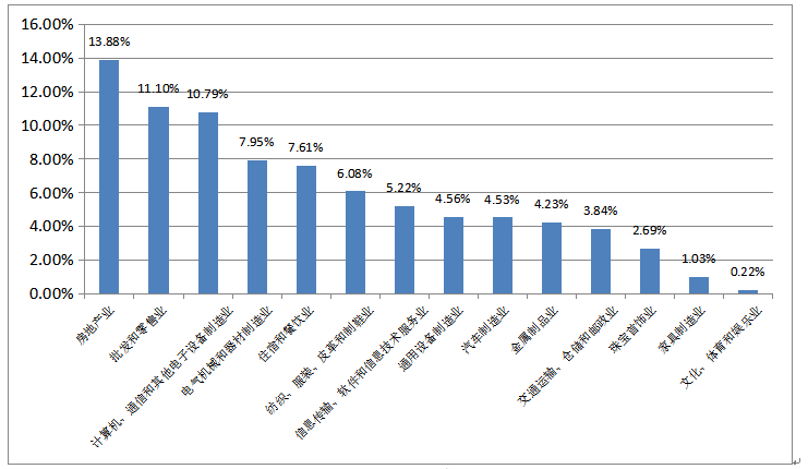 14個行業中,每個行業流失人數占流失總人數比例排名前三的是:批發和零售業,計算機、通信和其他電子設備制造業,房地產業,分別占比14.34%、12.81%、10.53%;占比最低的是文化、體育和娛樂業,為0.09%。