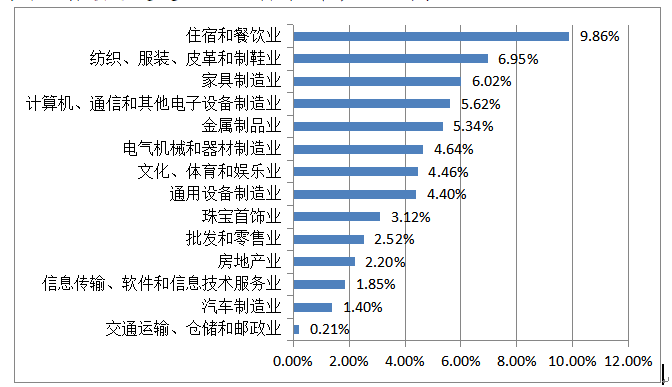 企業在第四季度內已招聘了5669人,實際缺工總人數為5712人。實際缺工總人數與在崗總人數之比(缺工率)為3.36%。14個行業中,缺工率排名前三的是:住宿和餐飲業,紡織、服裝、皮革和制鞋業,家具制造業,分別為9.86%、6.95%、6.02%。缺工率最低的是交通運輸、倉儲和郵政業,為0.21%。