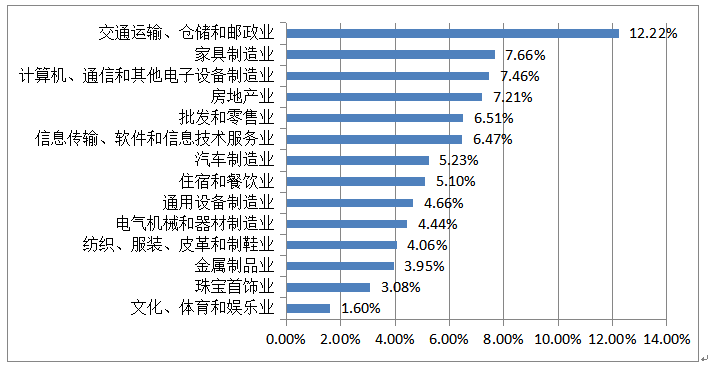 企業流失總人數與在崗總人數之比(流失率)為5.78%。14個行業中,流失率排名前三的是:交通運輸、倉儲和郵政業,家具制造業,計算機、通信和其他電子設備制造業,分別是12.22%、7.66%、7.46%。流失率最低的是文化、體育和娛樂業,為1.60%。