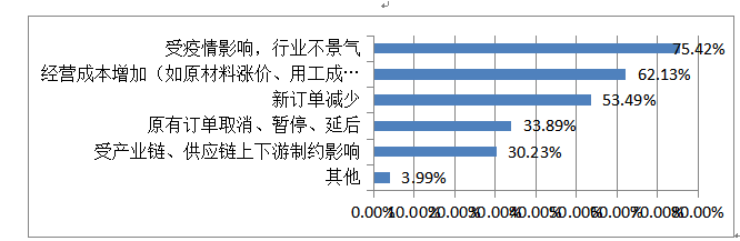 據1030家企業填報數據統計,2021年以來企業生產經營情況與2020年相比好、較好、持平、較差、差的企業分別占比8%、16%、47%、25%、4%。其中“較差”和“差”的企業主要表現在“受疫情影響,行業不景氣”“經營成本增加(如原材料漲價、用工成本增加),利潤空間收窄”“新訂單減少”,分別有75.42%、62.13%、53.49%的企業選擇。