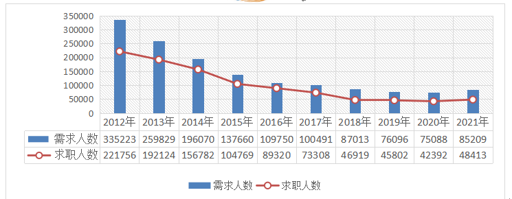 原因分析:上述數據有一定程度的增幅,主要原因:一是2020年受疫情影響,企業生產受到較大影響,人員流動不夠暢通,導致企業招聘人數和求職者人數都減少;二是2021年疫情情況好轉,企業招聘人數和求職者人數恢復到正常水平,相比之下有一定的增幅。