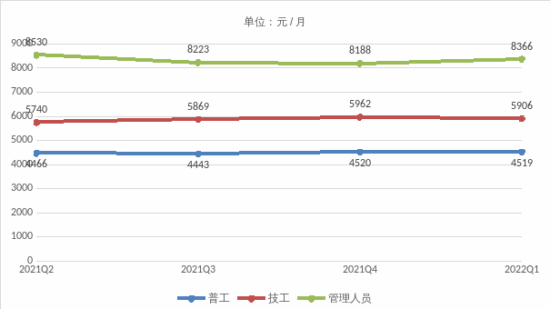 2022年第一季度末,企業在崗員工中,普工的平均工資為4830元/月,同比上升9.45%;技工的平均工資為5578元/月,同比上升11.63%;專業技術及管理人員的平均工資為7590元/月,同比上升13.72%。