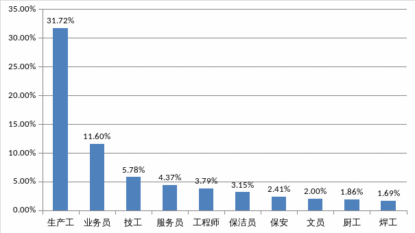 企業緊缺的職位總人數有4190人,其中排名前三的是:生產工、業務員、技工,分別占比31.72%、11.60%、5.78%。