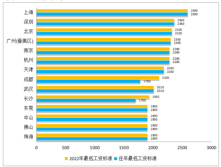 截至2022年第一季度末,十四個重點城市中有二個城市的企業最低工資標準上調,分別是:成都市2100元/月,同比提高17.98%;長沙市1930元/月,同比提高13.53%。番禺區企業最低工資執行廣州市的標準2300元/月,非全日制職工小時最低工資標準22.2元/小時。