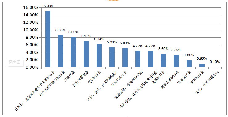 2022年第一季度,14個行業中用工量占比排名前三的是:批發和零售業,房地產業,計算機、通信和其他電子設備制造業,分別占用工總量11.95%、11.87%、8.80%。用工量最少的是文化、體育和娛樂業,占用工總量0.32%。用工量變化大的行業有房地產業,同比增長了4.78%,其他行業用工量變化較小。