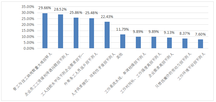 有“招工難”現象的企業中認為存在“招工難”問題的主要原因是:普工與技工缺崗數量大難招夠人,有29.66%企業選擇;企業員工工資福利待遇問題招不到人,有28.52%企業選擇;工人技能水平達不到企業要求招不到人,有25.86%企業選擇;外來務工人員返鄉招不到人,有25.48%企業選擇;人才供求錯位,結構性矛盾招不到人,有22.43%企業選擇。