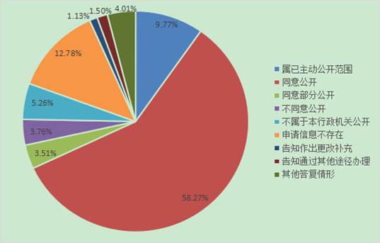 答復(fù)政府信息公開申請共798宗。其中,屬已主動公開范圍78宗,占9.77%;同意公開465宗,占58.27%;同意部分公開28宗,占3.51%;不同意公開30宗,占3.76%;不屬于本行政機關(guān)公開42宗,占5.26%;申請信息不存在102宗,占12.78%;告知作出更改補充9宗,占1.13%;告知通過其他途徑辦理12宗,占1.50%;其他答復(fù)情形32宗,占4.01%。